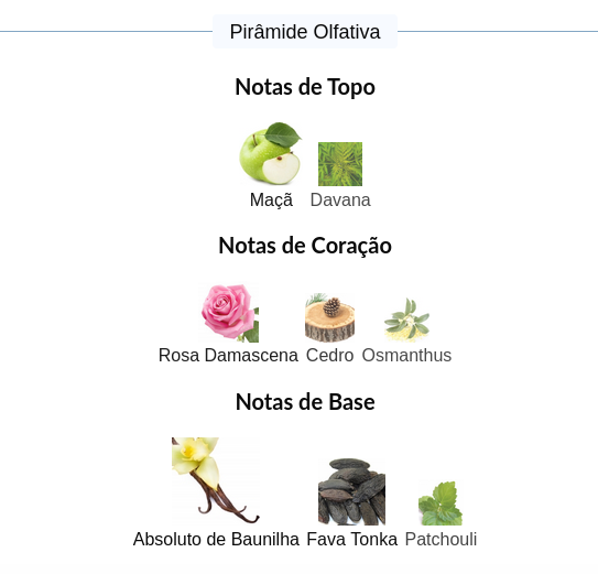 As notas de fundo são: Absoluto de Baunilha, Fava Tonka e Patchouli.