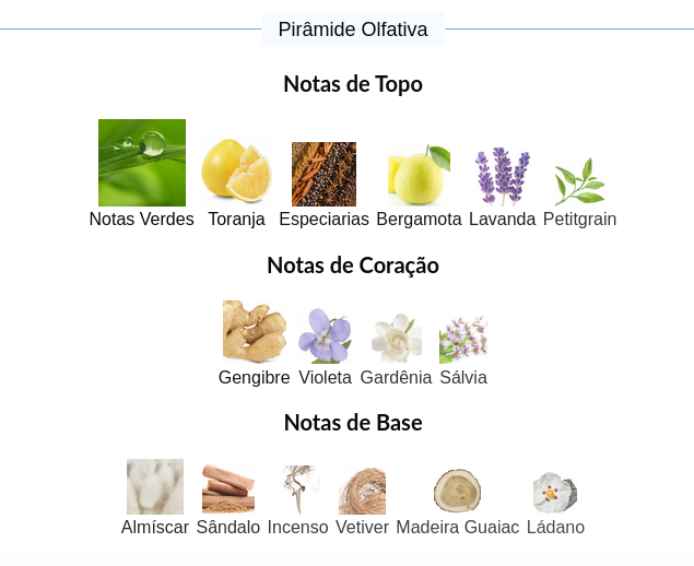 As notas de topo são: Notas Verdes, Toranja, Especiarias, Bergamota, Lavanda e Petitgrain.