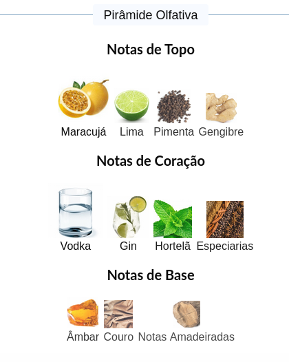 As notas de topo são: Maracujá, Lima, Pimenta e Gengibre.
