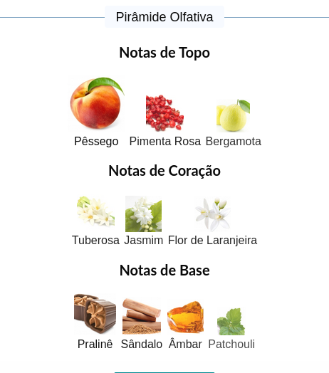As notas de fundo são: Sândalo, Pralinê, Âmbar e Patchouli.