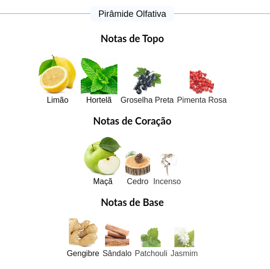 As notas de fundo são: Gengibre, Sândalo, Patchouli e Jasmim.