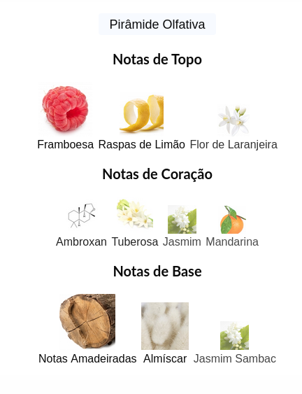 As notas de topo são: Framboesa, Raspas de Limão e Flor de Laranjeira.