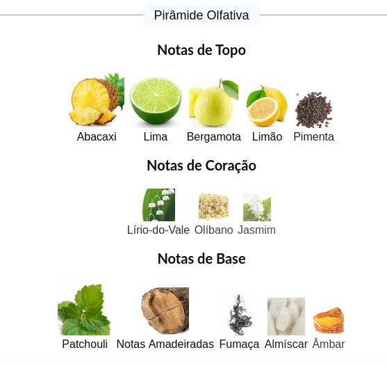 As notas de topo são: Abacaxi, Lima, Bergamota, Limão e Pimenta.