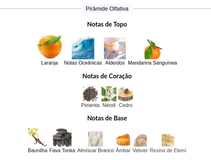As notas de topo são: Laranja, Notas Oceânicas, Aldeídos e Mandarina Sanguínea.