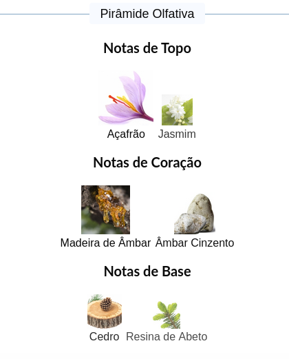 As notas de fundo são: Madeira de Cashmere, Âmbar Cinzento e Sândalo.
