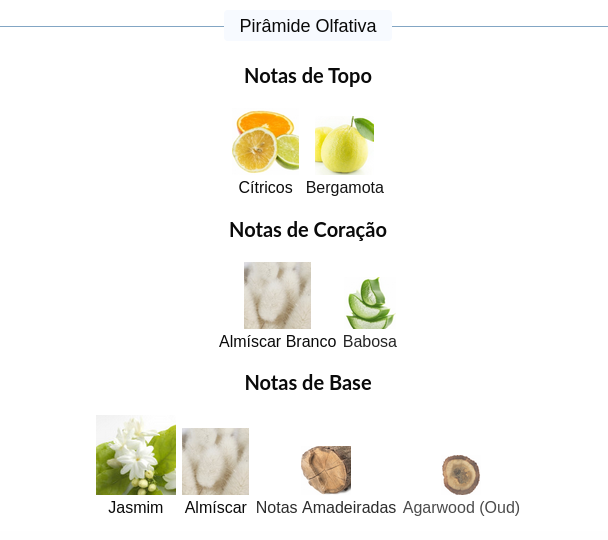 As notas de fundo são: Jasmim, Almíscar, Notas Amadeiradas e Agarwood (Oud).