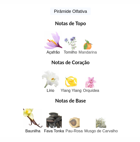 As notas de coração são: Lírio, Ylang Ylang e Orquídea.