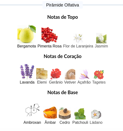 As notas de coração são: Lavanda, Gerânio, Elemi, Tagetes, Vetiver e Açafrão.