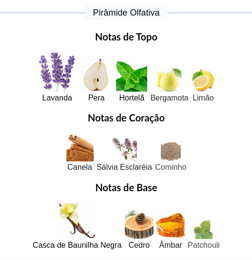 As notas de topo são: Lavanda, Pera, Hortelã, Limão e Bergamota.