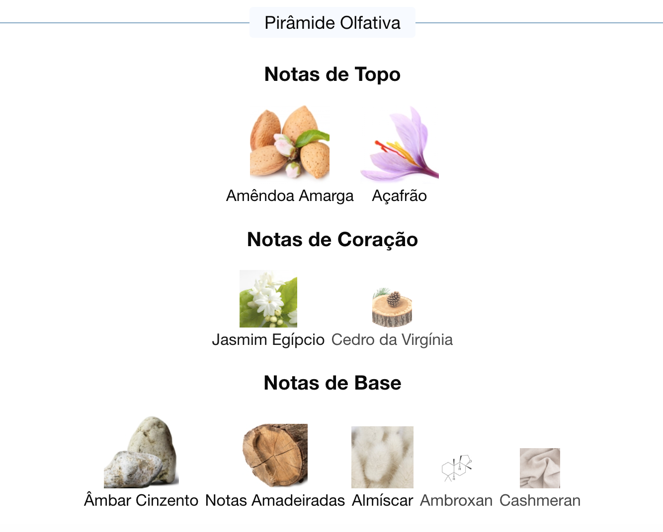 As notas de fundo são: Âmbar Cinzento, Notas Amadeiradas, Almíscar, Ambroxan e Cashmeran.