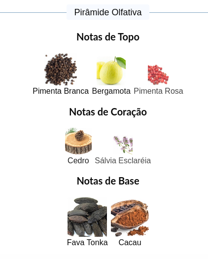 As notas de coração são: Cedro e Sálvia Esclaréia.
