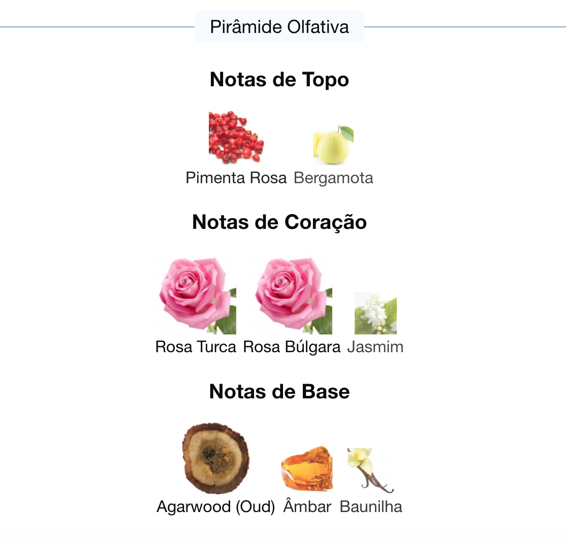As notas de coração são: Rosa Turca, Rosa Búlgara e Jasmim.