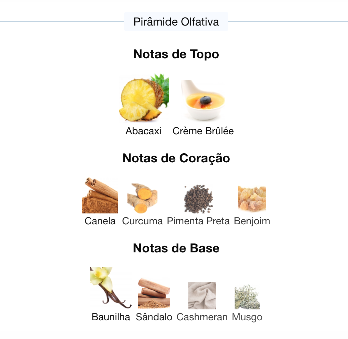 As notas de coração são: Canela, Curcuma, Pimenta Preta e Benjoim.