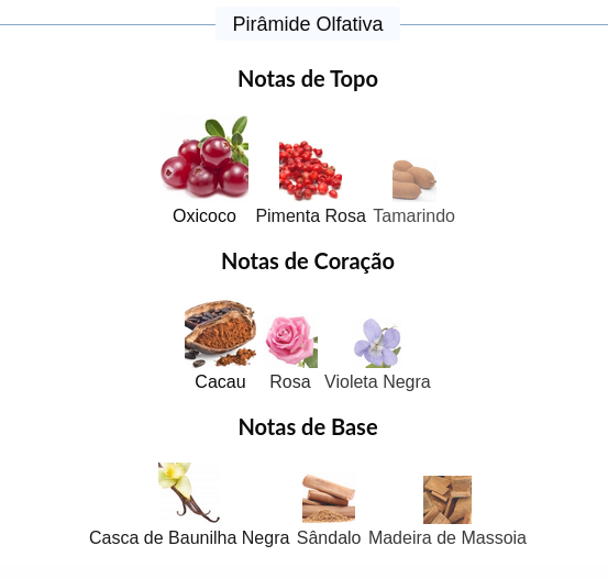 As notas de coração são: Cacau, Rosa e Violeta Negra.