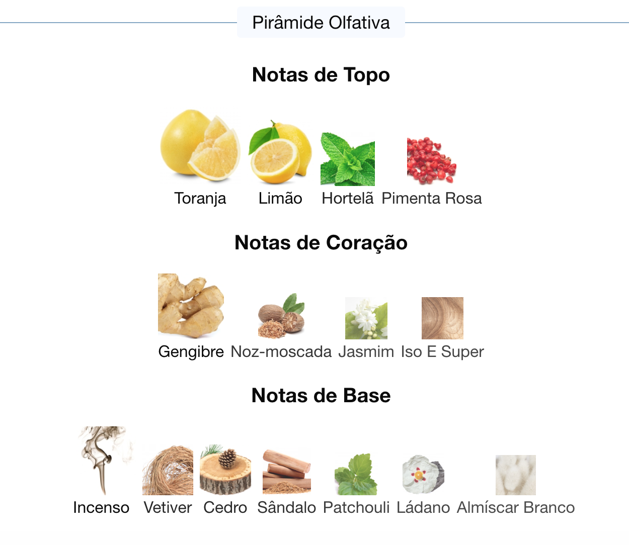 As notas de topo são: Toranja, Limão, Hortelã e Pimenta Rosa.