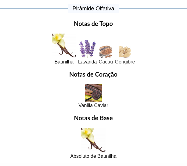 As notas de topo são: Baunilha, Lavanda, Cacau e Gengibre.
