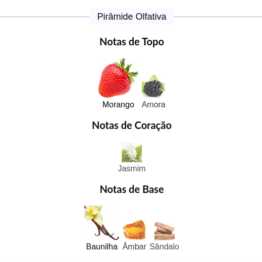 As notas de fundo são: Baunilha, Âmbar e Sândalo.