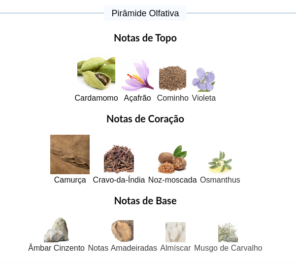 As notas de topo são: Cardamomo, Açafrão, Cominho e Violeta.