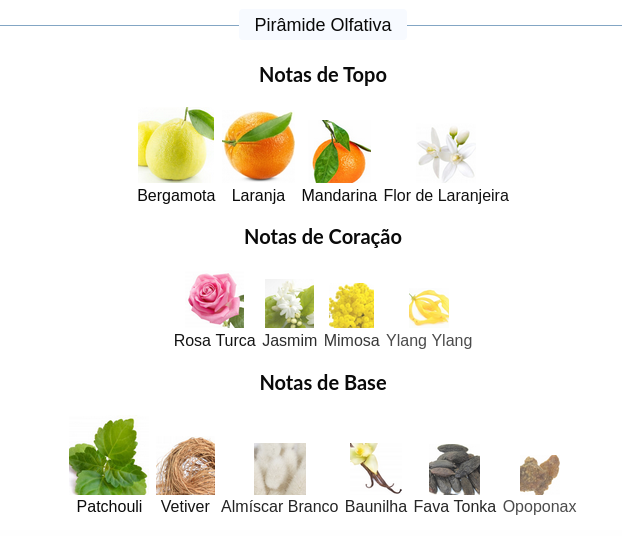 As notas de topo são: Laranja, Bergamota, Mandarina e Flor de Laranjeira.