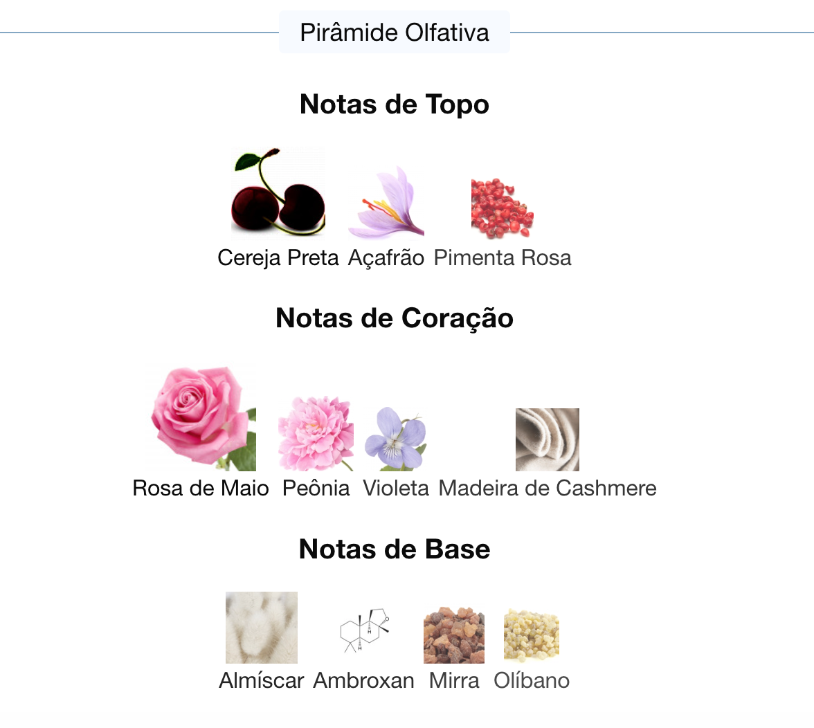 As notas de coração são: Rosa de Maio, Peônia, Violeta e Madeira de Cashmere.