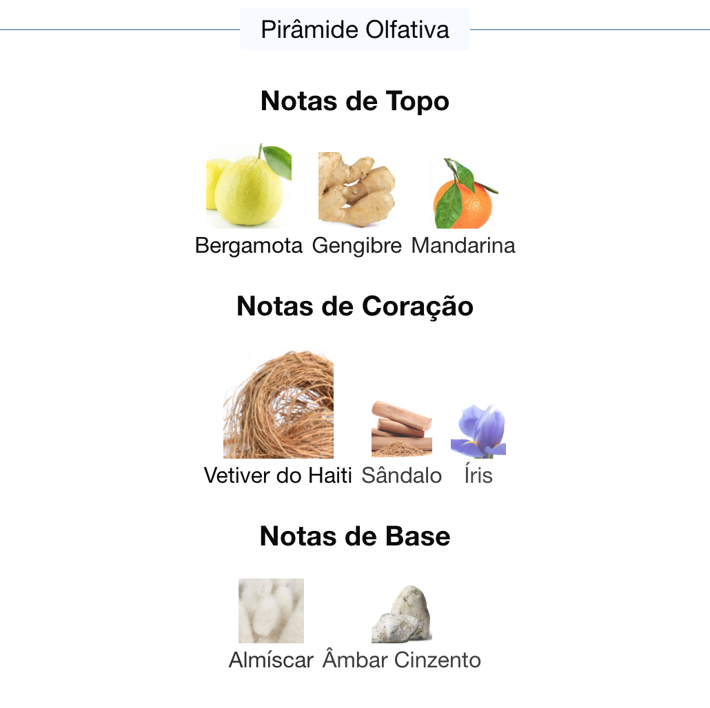 As notas de coração são: Vetiver do Haiti, Sândalo e Íris.