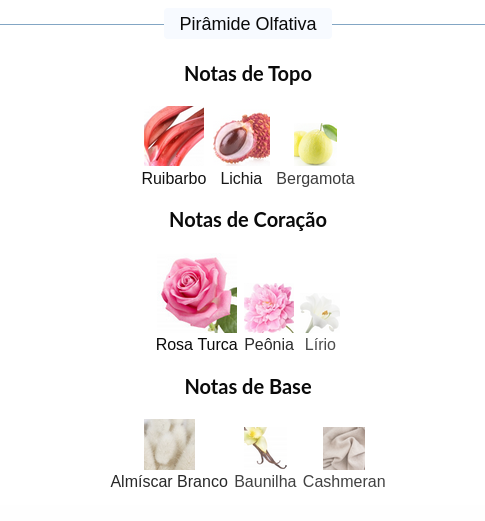 As notas de coração são: Rosa Turca, Peônia e Lírio.