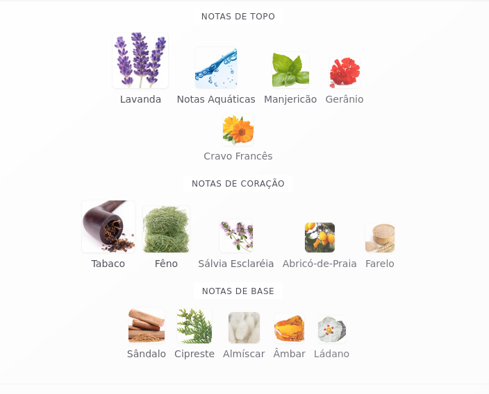 As notas de fundo são: Sândalo, Cipreste, Almíscar, Âmbar e Ládano.