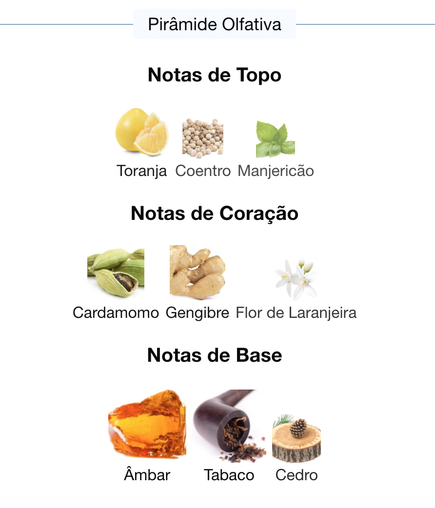 As notas de fundo são: Âmbar, Tabaco e Cedro.