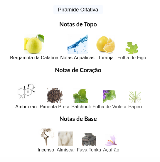 As notas de coração são: Ambroxan, Pimenta Preta, Patchouli, Folha de Violeta e Papiro.