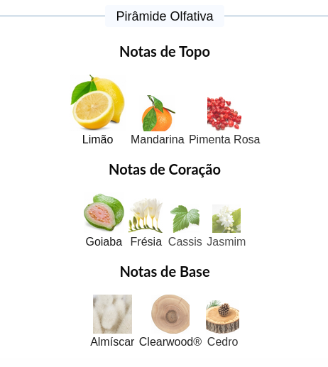As notas de coração são: Goiaba, Frésia, Cassis e Jasmim.