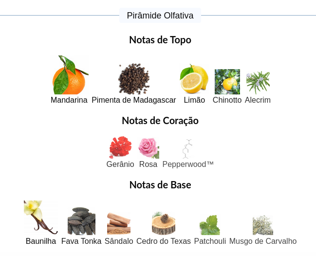 As notas de topo são: Mandarina, Pimenta de Madagascar, Limão, Chinotto e Alecrim.