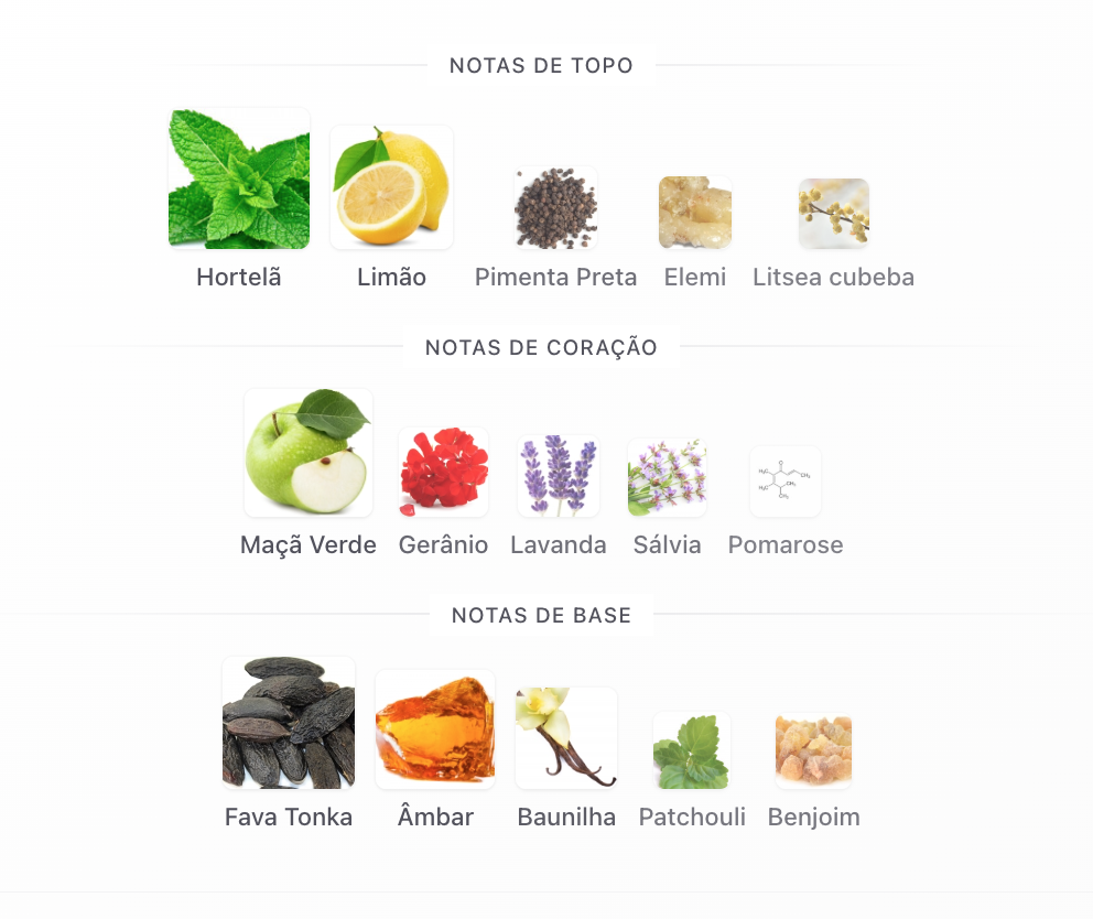 As notas de topo são: Hortelã, Limão, Pimenta Preta, Elemi e Litsea cubeba.