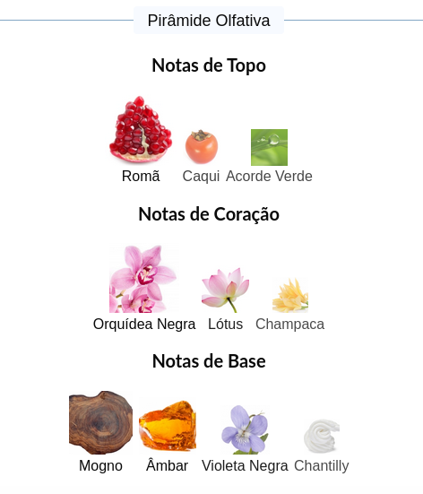 As notas de coração são: Orquídea Negra, Lótus e Champaca.