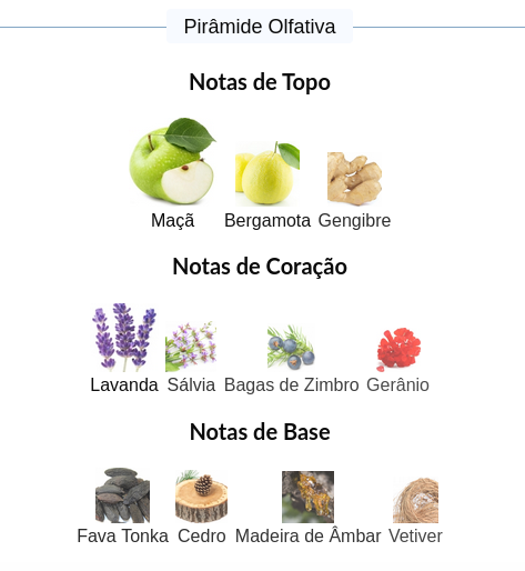 As notas de coração são: Lavanda, Sálvia, Bagas de Zimbro e Gerânio.