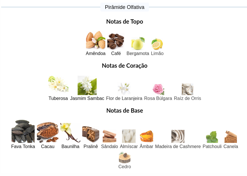 As notas de fundo são: Fava Tonka, Cacau, Baunilha, Pralinê, Sândalo, Almíscar, Âmbar, Madeira de Cashmere, Patchouli, Canela e Cedro.