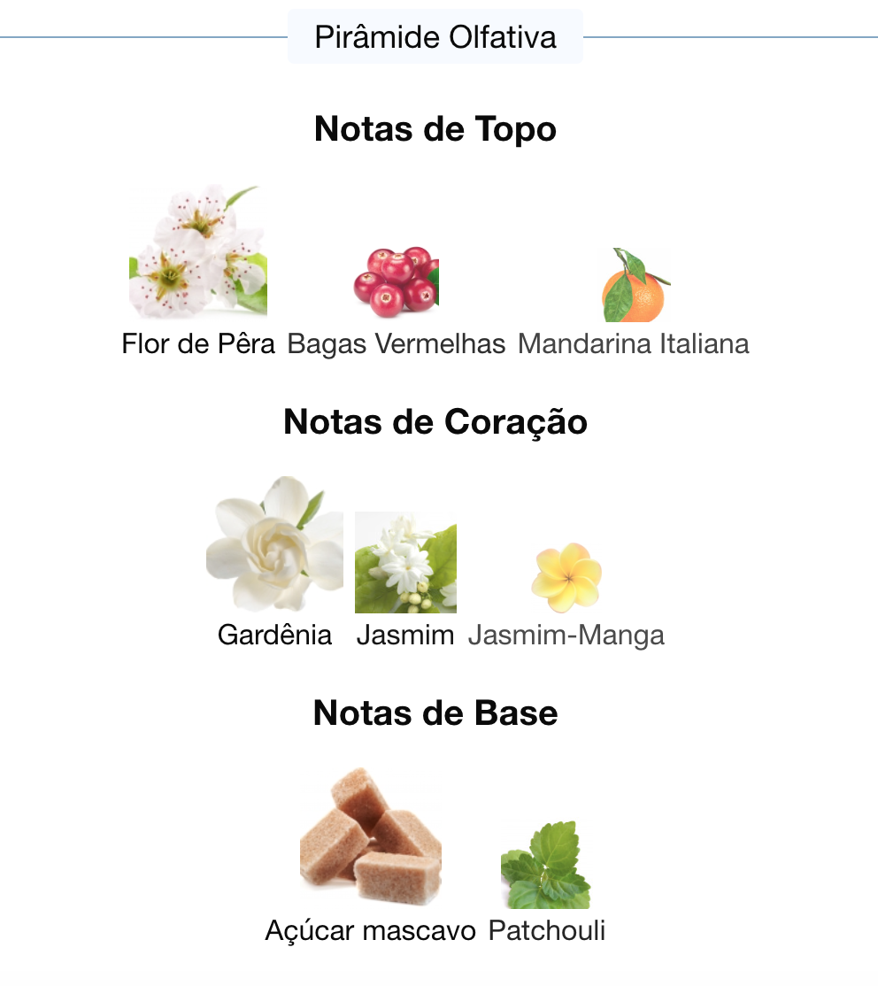 As notas de topo são: Flor de Pêra, Bagas Vermelhas e Mandarina Italiana.