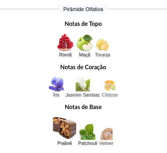 As notas de fundo são: Pralinê, Patchouli e Vetiver.
