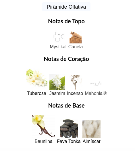 As notas de coração são: Tuberosa, Jasmim, Incenso e Mahonial®.