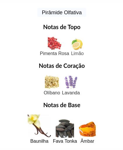 As notas de fundo são: Baunilha, Fava Tonka e Âmbar.