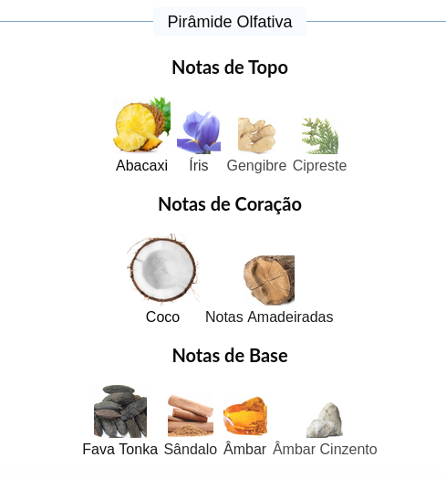 As notas de fundo são: Fava Tonka, Sândalo, Âmbar e Âmbar Cinzento.