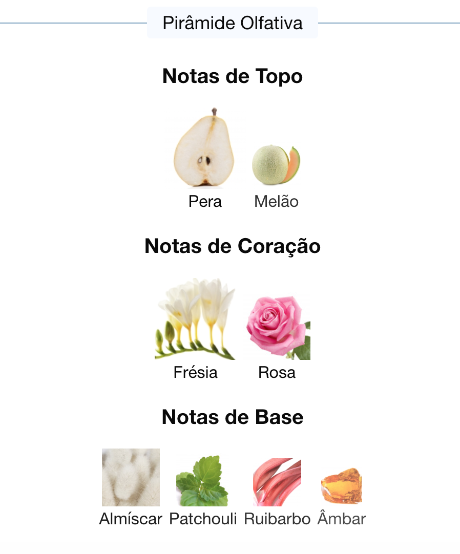 As notas de fundo são: Almíscar, Patchouli, Ruibarbo e Âmbar.