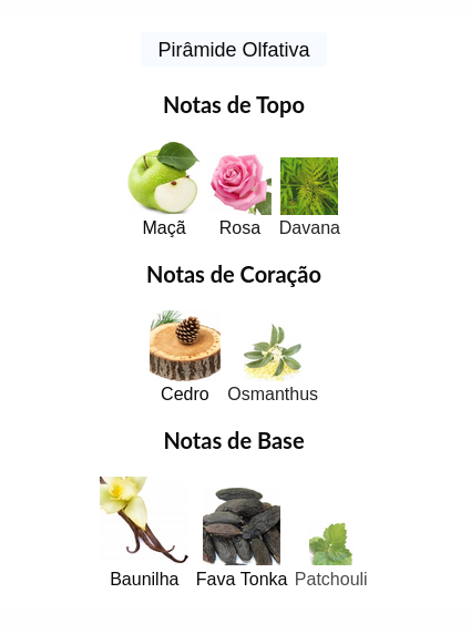 As notas de fundo são: Fava Tonka, Baunilha e Patchouli.
