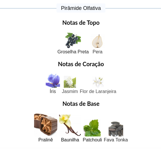 As notas de fundo são: Pralinê, Baunilha, Patchouli e Fava Tonka.
