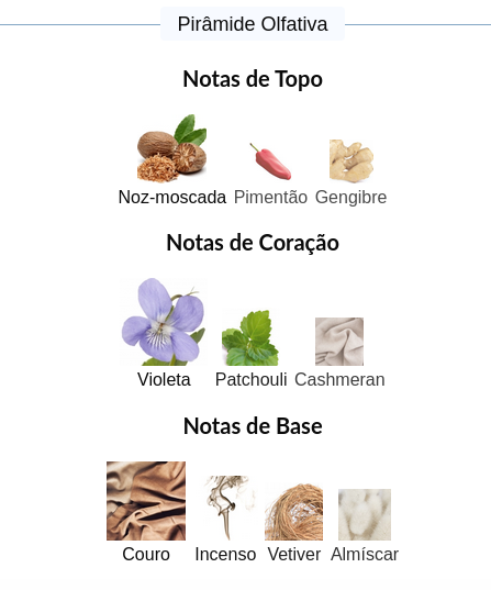 As notas de topo são: Noz-moscada, Pimentão e Gengibre.