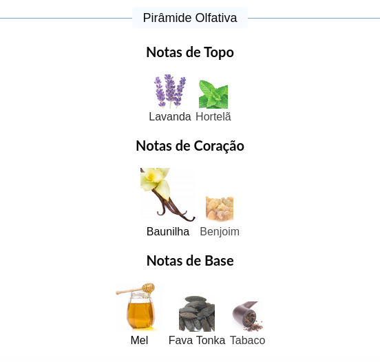 As notas de fundo são: Mel, Fava Tonka e Tabaco.