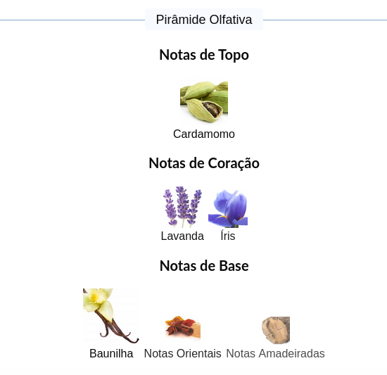 As notas de fundo são: Baunilha, Notas Orientais e Notas Amadeiradas.