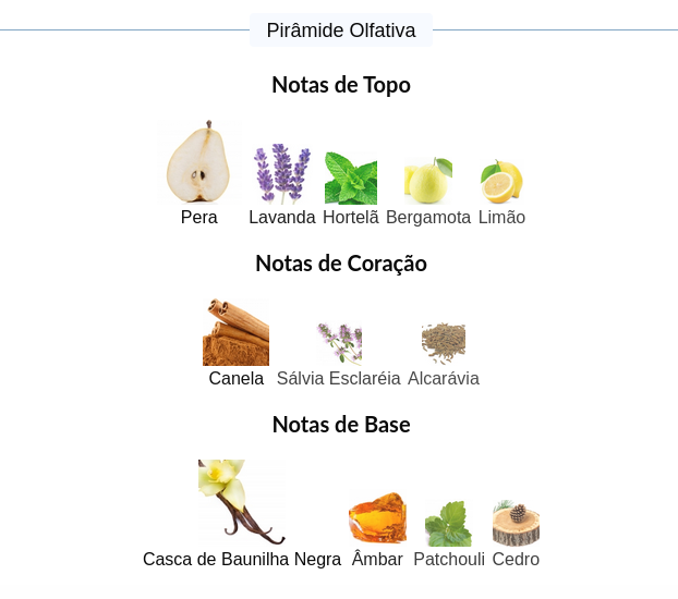 As notas de coração são: Canela, Sálvia Esclaréia e Alcarávia.