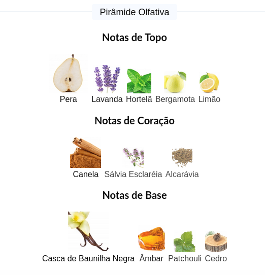 As notas de coração são: Canela, Sálvia Esclaréia e Alcarávia.