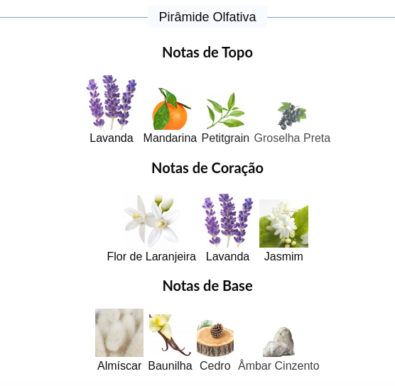 As notas de topo são: Lavanda, Mandarina, Petitgrain e Groselha Preta.