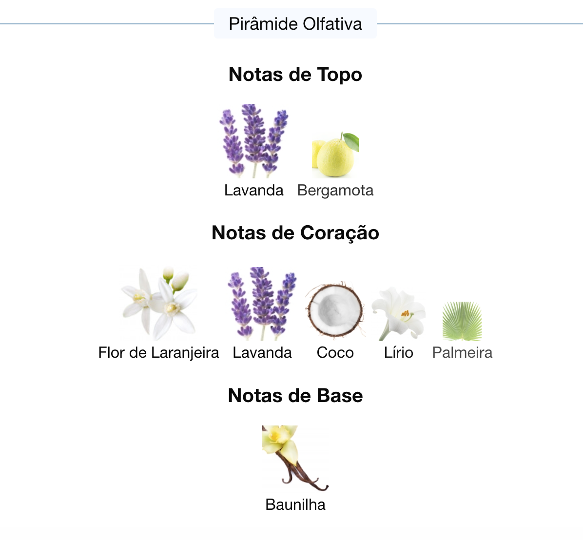 As notas de coração são: Flor de Laranjeira, Lavanda, Coco, Lírio e Palmeira.